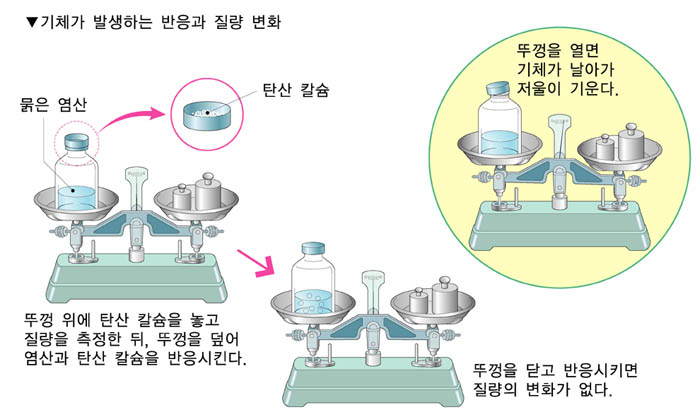 이 반응에서 이산화 탄소 기체가 날아가지 못하도록 병마개를 잘 막으면, 거품이 발생하여도 전체 질량은 변하지 않는다. 그러나 병마개를 열고 측정하면 기체가 날아가 질량이 감소한다. 이와 같이 기체가 발생하는 화학 반응에서 반응 전후의 물질의 총질량은 변하지 않는다.